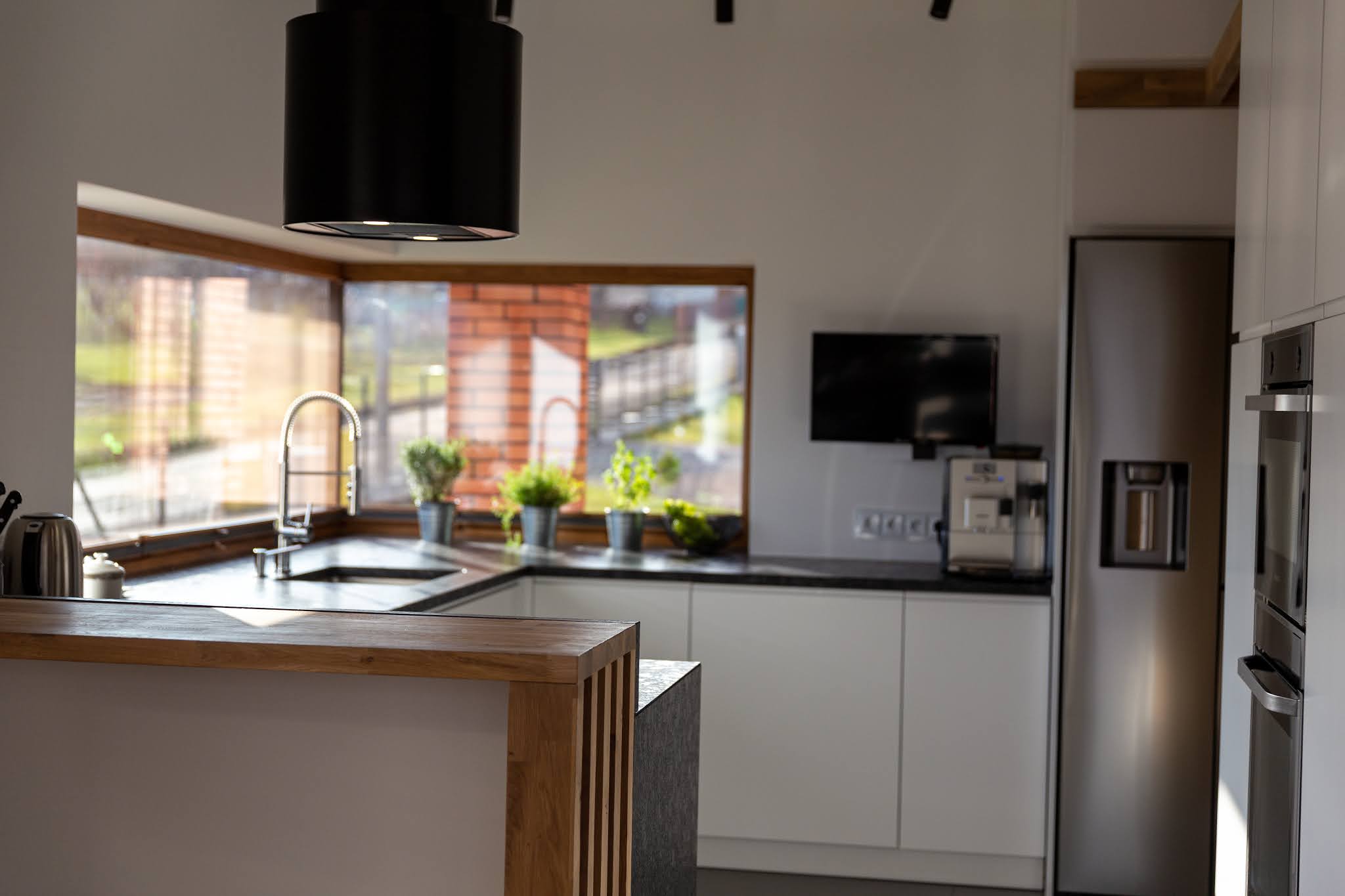 Biorąc pod uwagę posiadanie spiżarni mogliśmy ograniczyć metraż kuchni tak aby najważniejsze sprzęty znajdowały się w zasięgu ręki.